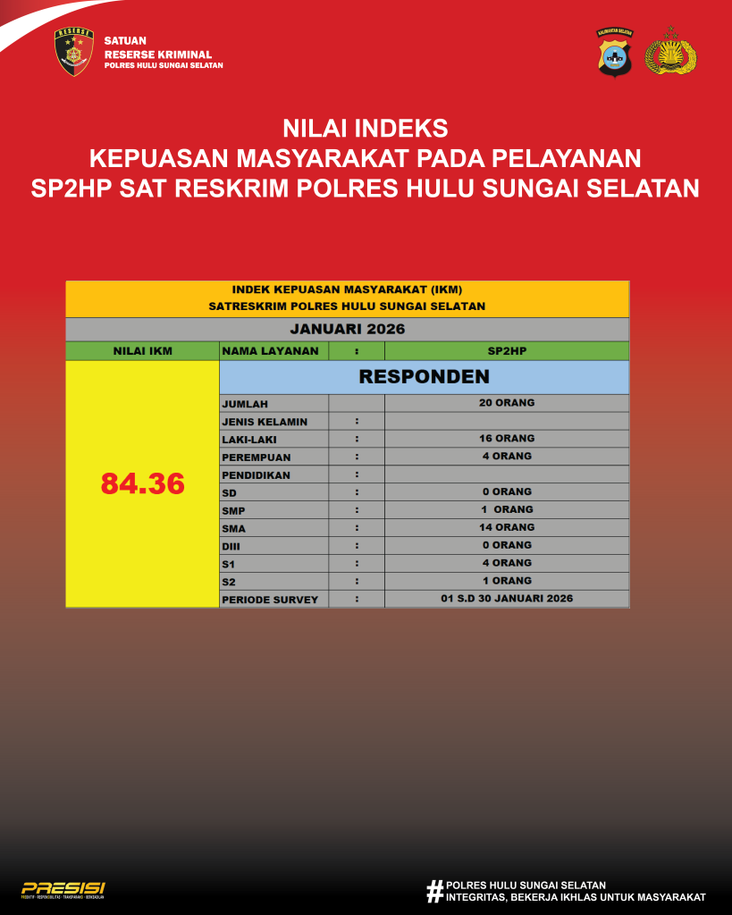 NILAI INDEKS KEPUASAN MASYARAKAT PADA PELAYANAN SP2HP SATRESKRIM POLRES HSS Februari 10, 2026 POLRES HSS RESKRIM